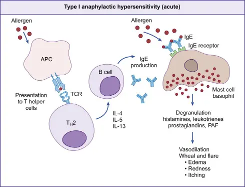 In IgE-mediated (type I) hypersensitivity, an allergen is first taken up by an antigen-presenting cell (APC), processed, and presented on MHC class II to a naïve T helper cell, which differentiates into a Th2 cell. The Th2 cell secretes cytokines such as IL-4, IL-5, and IL-13 that stimulate B cells to undergo class switching and produce allergen-specific IgE antibodies. These IgE molecules bind to high‑affinity FcεRI receptors on the surface of mast cells and basophils, arming them for future reactions. Upon re-exposure, the same allergen cross‑links the IgE on these cells, triggering degranulation and release of mediators including histamine, leukotrienes, prostaglandins, and platelet-activating factor, which cause vasodilation and increased vascular permeability, clinically manifesting as wheal and flare, edema, redness, and itching.